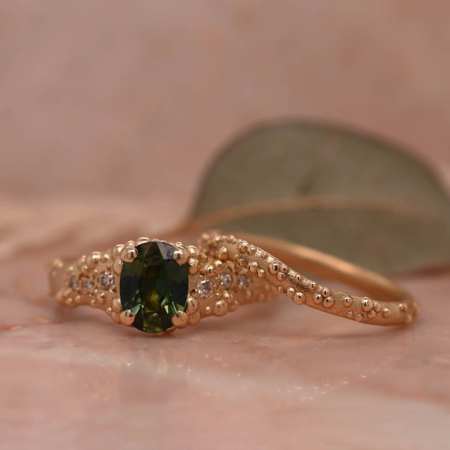 Orno 7x5mm Oval Green Sapphire and Diamond Textured Engagement Ring